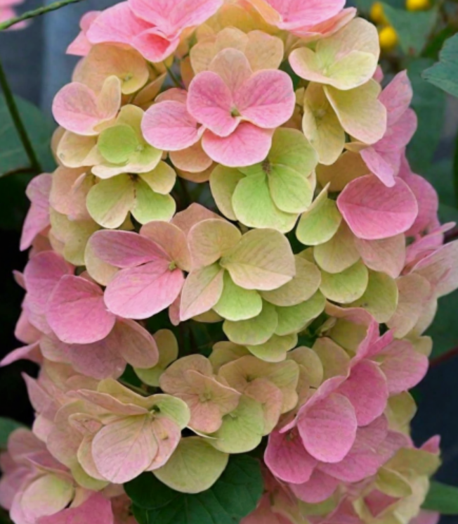 Куст прекрасной шаровидной формы. Окраска меняется по мере цветения от зеленого к нежно-розовому и затем приобретает яркий малиновый цвет.