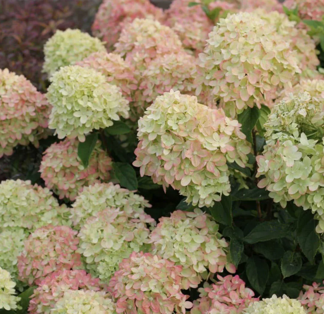Куст прекрасной шаровидной формы. Окраска долгое время остается зеленой. Осенью приобретает легкое розовое напыление.