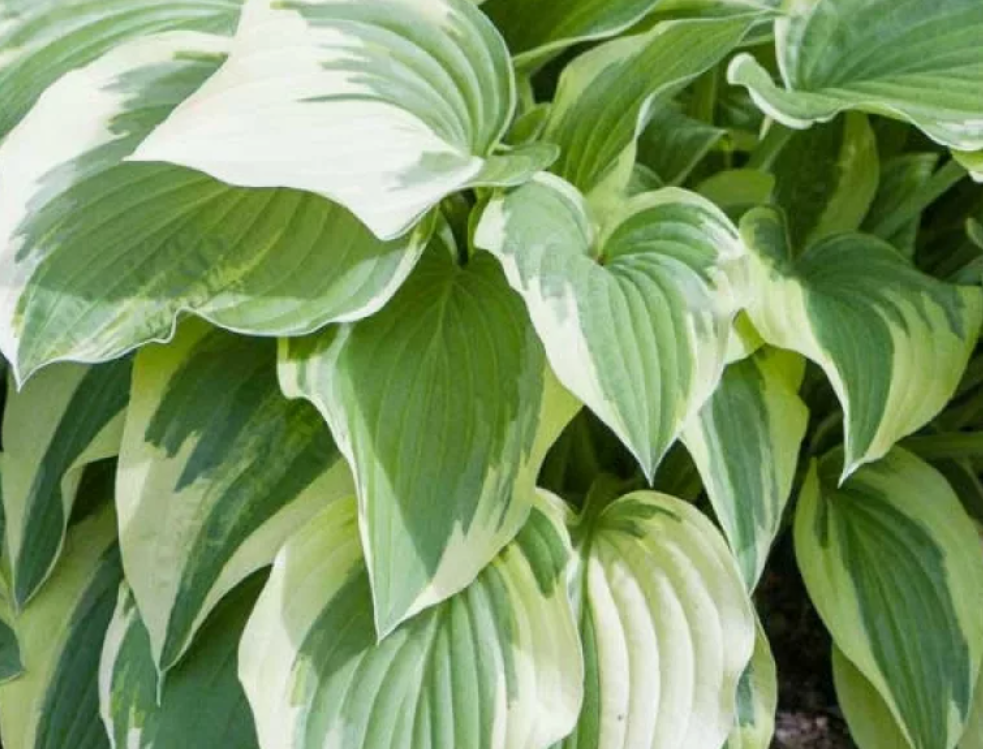 Красивая хоста с широкими листьями зеленая с голубоватым оттенком, с белыми штрихами