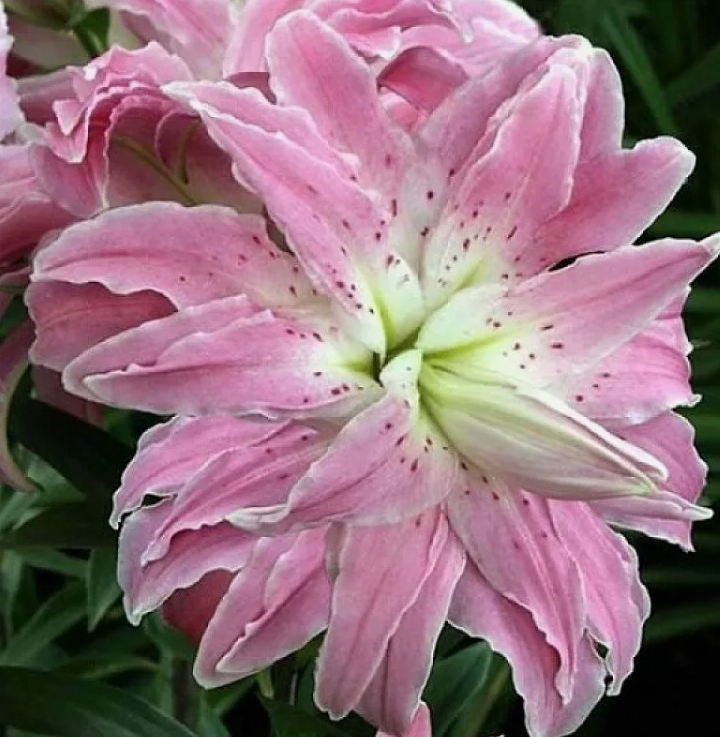 Восточная махровая лилия с красивой формой цветка, напоминающей лотос.