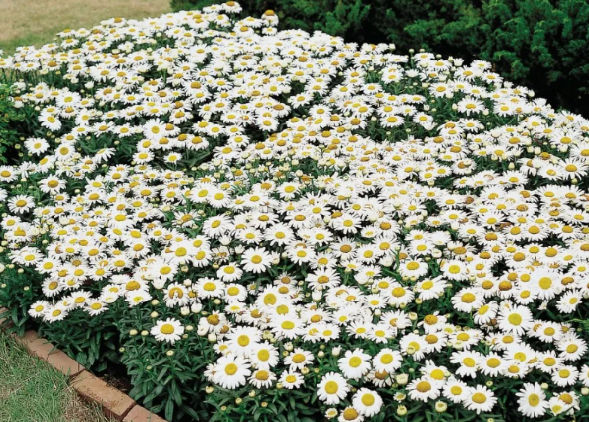 Шикарный низкорослый сорт нивяника, высотой 25-35см, ширина куртины 35см. Кусты округлой формы, очень красивые. Можно выращивать в вазонах. Цветки крупные, 10-15см в диаметре.