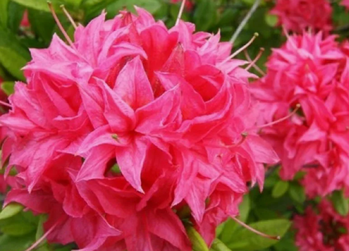 Красивейший листопадный рододендрон, цветет в июне крупными красными круглыми шарами.