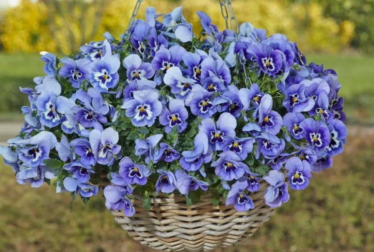 Ампельный сорт виолы с очень крупными выразительными цветками, зацветает рано, цветет все лето непрерывно.